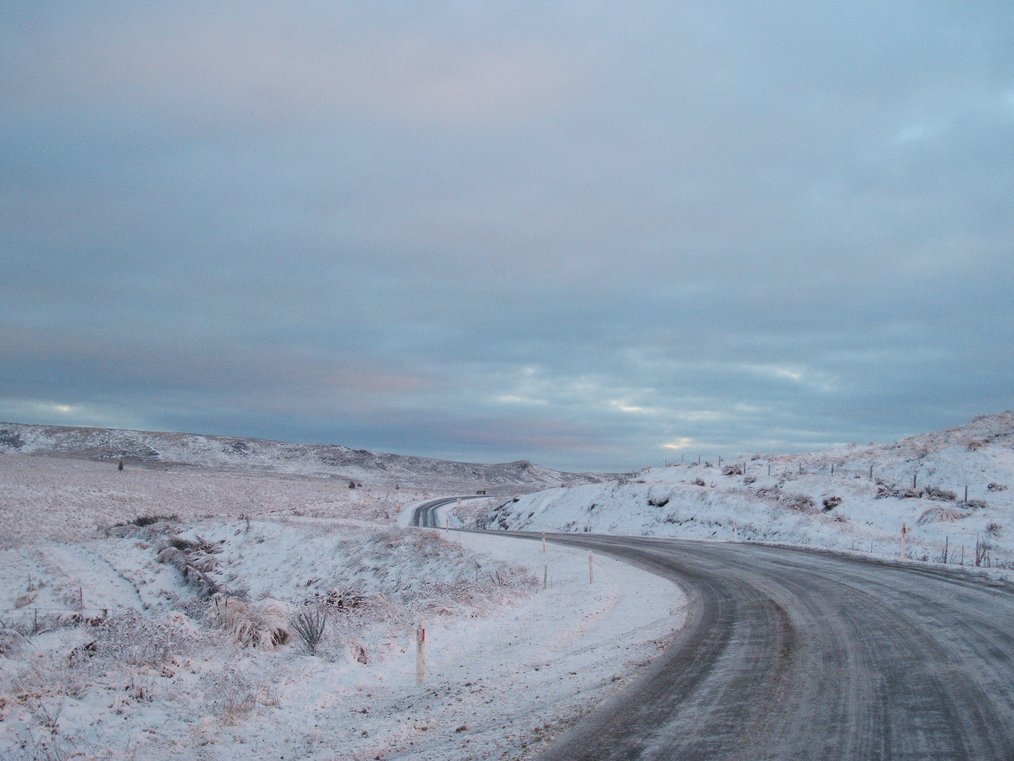 Je ne pourrais jamais décrire la beauté du paysage ce matin-là… J’ai pris des photos, mais elles ne retranscrivent en aucun cas le silence, la paix, le bien-être, et l’harmonie que nous réservait le Central Otago en ce lundi matin… C’était une vision féerique ; le soleil venait de se lever au dessus de ces vastes collines enneigées, le ciel était teinté de rose et de bleu, un léger vent revigorant soufflait discrètement, et l’on sentait que pas une âme n’habitait à des kilomètres à la ronde… Une jolie route verglacée, unique signe d’humanité dans ce coin retranché de la planète, traversait ces collines infiniment belles… Des traces de pneu sur le bas-côté indiquaient qu’une voiture avait décidé de périr ici…