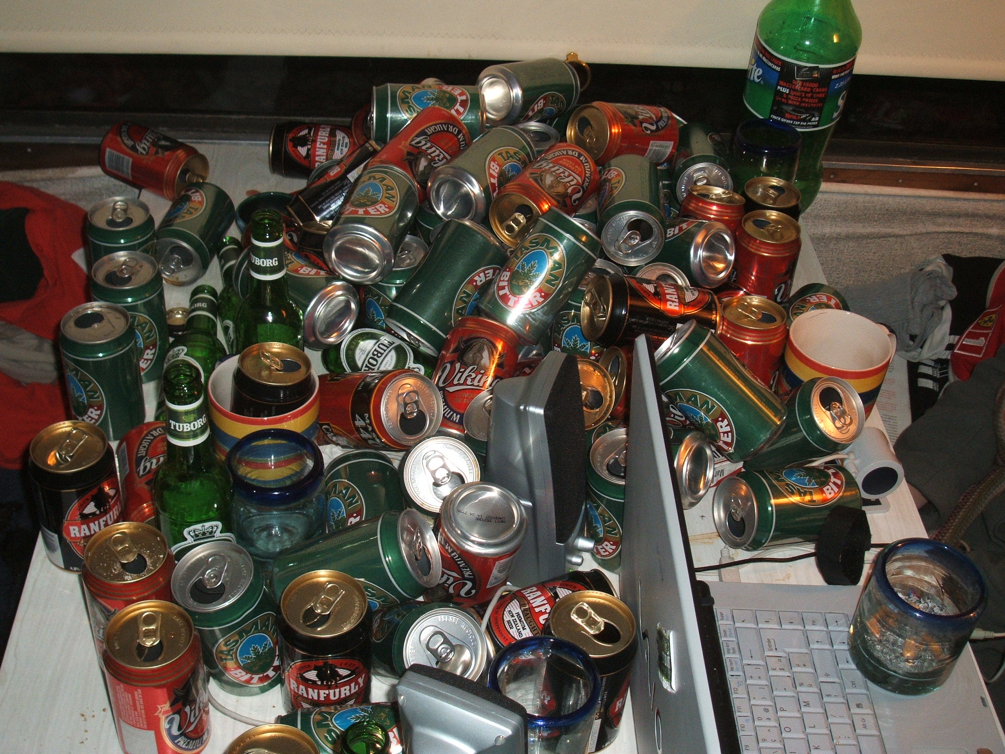 Dan, mon coloc’ anglais, est lui aussi devenu un fan de ces apéros caravane. Hier, il s’est mis une race d’anthologie — le pauvre il n’arrivait plus à sortir de la « prison », ce jeu stupide où les chiffres des dés nous dictent si l’on doit boire ou pas. Et ce après s’être pris plusieurs « vingt et un » en début de soirée (là aussi un jeu guère très fin où l’auteur d’un 21 avec les dès annonce quelle personne doit boire son prochain vert cul-sec). Ce matin, je l’ai vu sur son vélo (il est facteur) zigzaguant comme pas possible et balançant les lettres en vrac… Chapeau bas cher Dan, il fallait de la volonté pour aller bosser ce matin !
